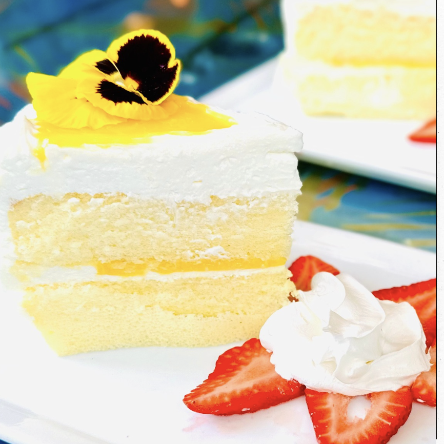 pillowy sponge cake, airy semi-sweet coconut cream, layered with passionfruit puree