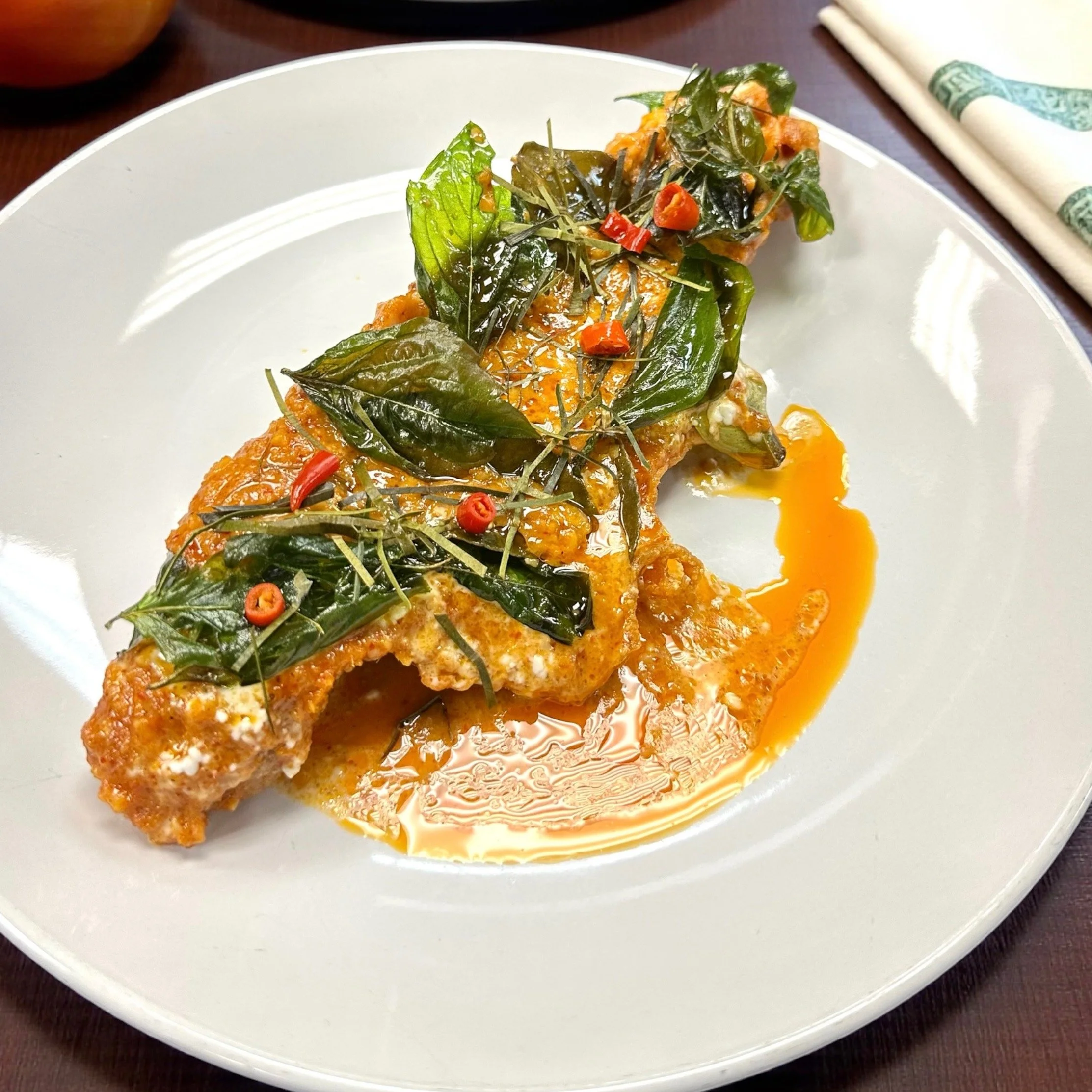 Fried 12 oz walleye fillet, choo chee curry, coconut milk, kaffir lime leaf, fried Thai basil, jasmine rice